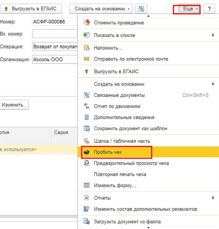 После того как все необходимые товары добавлены и информация дополнена, можно нажать кнопку «Сохранить», а затем кнопку «Еще» — «Пробивка чека», чтобы распечатать чек.