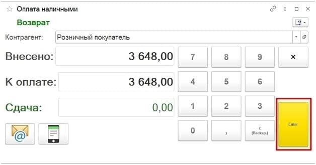 Кассир должен нажать кнопку Enter, чтобы подтвердить сумму и продолжить операцию.